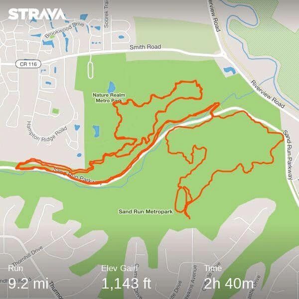 The Nuthatch and Dogwood trails traverse the Sand Run Metro Park. You will also run part of the jogging trail and skirt the lower part of Seiberling Naturealm.